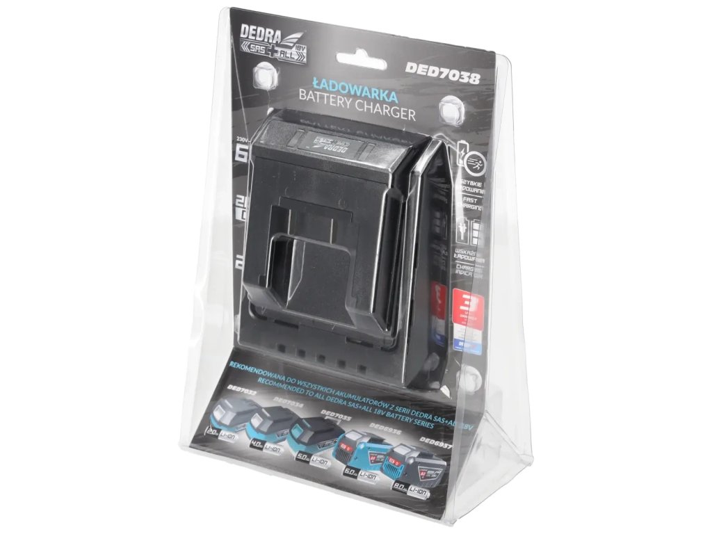 Nabíječka DEDRA DED7038 je určena pro bezpečné a efektivní nabíjení akumulátorů SAS+ALL, konkrétně modelů DED7032, DED7034, DED7035, DED6936 a DED6937. Je vybavena dvěma LED kontrolkami – jedna informuje o připojení k síti a druhá signalizuje dokončení nabíjecího procesu. Díky tomu je stav nabíjení vždy přehledný a uživatel má okamžitou kontrolu nad postupem.