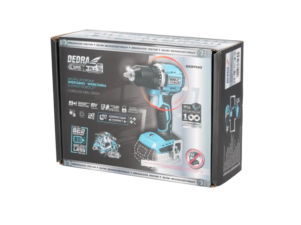 Akumulátorová vrtačka/šroubovák DEDRA DED7143 ze systému SAS+ALL je výkonný bezpříklepový nástroj určený pro šroubování a vrtání do dřeva, kovu a plastů. Bezkartáčový motor poskytuje vysoký výkon, delší životnost a lepší efektivitu. Díky kompaktní délce pouhých 170 mm je ideální pro práci ve stísněných a hůře přístupných místech.