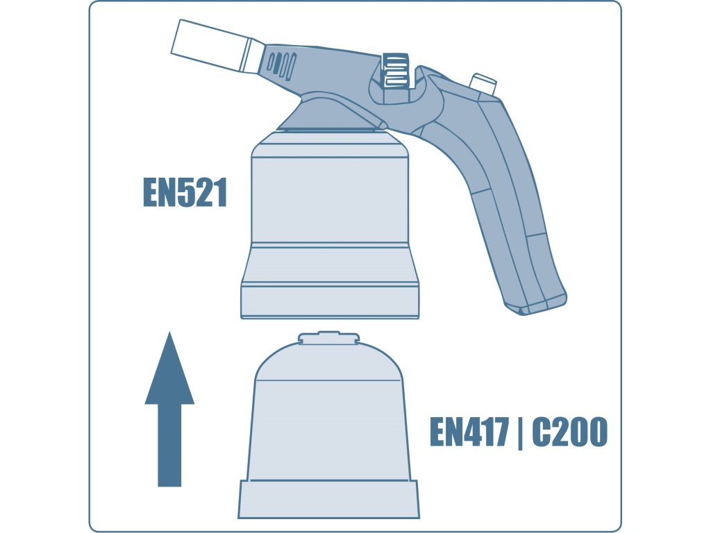 Bezpečnostní informace: Používejte pouze kartuše splňující normu EN 417. Při nasazování kartuše ji propíchněte ve svislé poloze a ujistěte se, že je bezpečně uchycena v kovovém držáku. Hořák používejte pouze ve větraných prostorách, mimo dosah dětí, a před každým použitím zkontrolujte těsnost spojů a stabilitu uchycení kartuše.