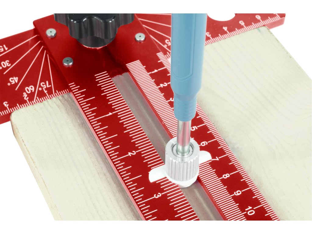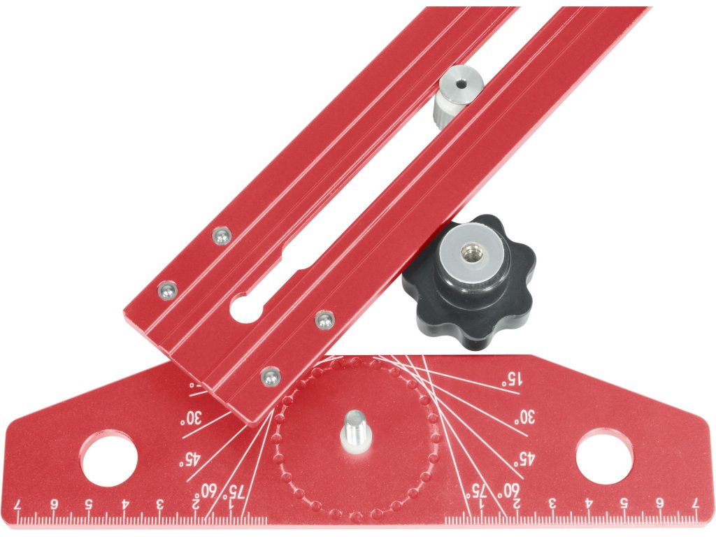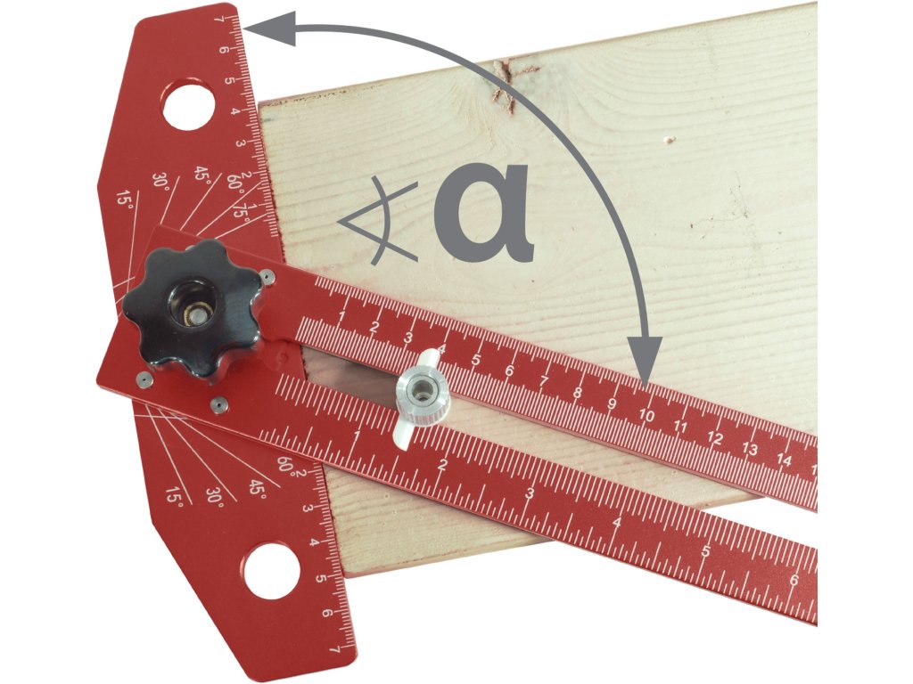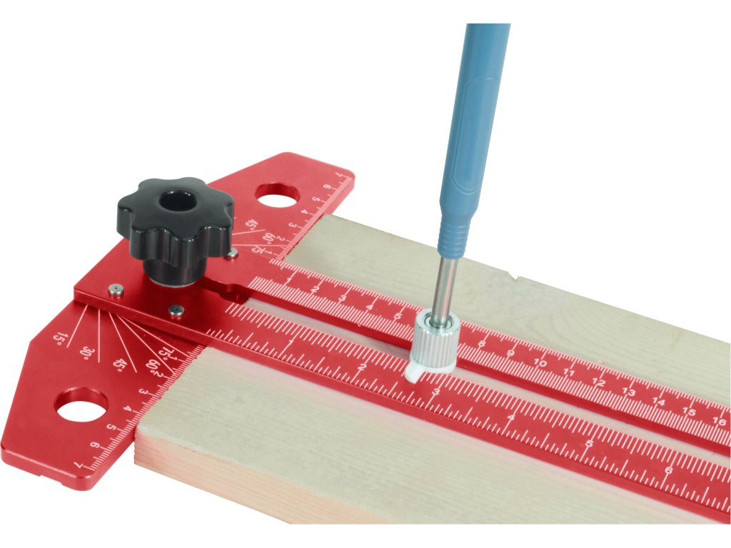 T-multifunkční úhelník Fortum 4784110 je ideálním nástrojem pro přesné značení a měření v dílně i na stavbě. Přednastavené úhly 15°, 30°, 45°, 60°, 75° a 90° lze díky systému "kuliček a důlků" snadno nastavit a pomocí přítlačné šroubovací matice pevně zafixovat bez nechtěného pohybu. Masivní hliníková konstrukce s anodizovaným povrchem zajišťuje dlouhou životnost a odolnost vůči poškození. Laserované stupnice přispívají k maximální přesnosti při práci. Posuvný značkovací jezdec je navržen pro tužky či značkovače s tuhou o průměru 2,8 mm, což z něj činí praktickou pomůcku pro rychlé a opakovatelné značení.