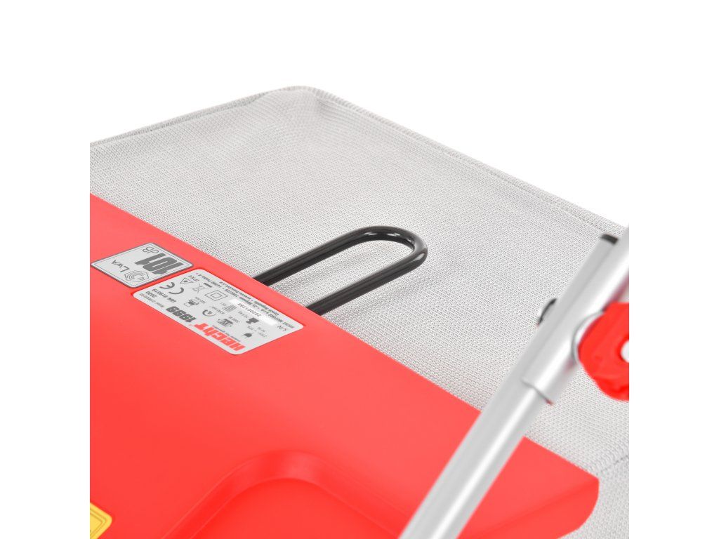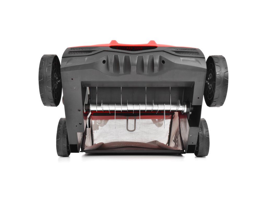 Motor o výkonu 2000 W zajišťuje dostatečnou sílu pro efektivní práci. Pracovní záběr 38 cm je ideální pro střední zahrady. Součástí balení jsou dva válce – nožový se 16 noži pro prořezání trávníku a drátkový pro odstranění plsti a mechu.