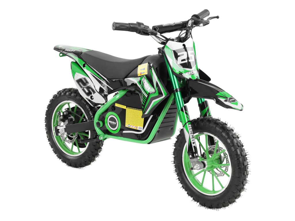 Elektrická motorka napájená akumulátorem 36 V 8 Ah. Dokonale tichý provoz bez emisí umožní motorku používat i v místech, kde není možné provozovat hlučné a čmoudící spalovací motory. Není proto problém dokonale se vyřádit i v neděli na zahradě, aniž by měl důvod soused jakkoli protestovat. Zároveň je však nutné mít na paměti, že motorka je natolik tichá, že její provoz v místech, kde se pohybují další osoby, může být nebezpečný, blížící se stroj totiž není slyšet. Základ motorky tvoří kvalitní ocelový rámdoplněný o stylové plastové kryty, které dotvářejí vzhled skutečného motocyklu. Přední kolo je uloženo v odpružené vidlici, závěšení zadního kola je řešeno centrálním odpružením, podobně jako skutečné motokrosové stroje. Ráfky z hliníkové slitinyjsou obuty do cross – enduro pneumatik, které zajišťují optimální přilnavost jak na pevném povrchu, tak v trávníku nebo na nezpevněné cestě. Přední i zadní kolo je vybaveno kotoučovými brzdami. Rychlost motorky lze omezit a uzamknout klíčkem na 7/15/25 km/h. Brzdy jsou ovládány páčkami na řídítkách. Na pravém řidítku je akcelerátor (plyn), jehož pootáčením je určována plynule rychlost jízdy. Vedle plynu je LED panel, který indikuje stav nabití akumulátoru. Široká ratingová řídítka (tzv. hrazdy) zajistí pohodlné ovládání. Pro zvýšení bezpečnosti jsou doplněna ve střední části o měkčený pěnový kryt. Motor o výkonu 500 W se jmenovitým točivým momentem 1,9 Nm si v mnohém nezadá se spalovacími motory. Motorka je velice svižná, její výkon a dojezd je však samozřejmě ovlivněn terénem a hmotností řidiče. Maximální zatížení je 75 kg, maximální dojezd je až 20 km na jedno nabití. Dodávána je včetně nabíječky, se kterou lze baterii dobít z běžné zásuvky za cca 8 hodin. Součástí dodávky je nabíječka, základní sada nářadí a polepy (samolepky). Tato motorka není dopravní prostředek, nesmí být používána na veřejných komunikacích! Hmotnost balení: 25 Rozměry balení: 108x31.5x52Doplňkové parametry