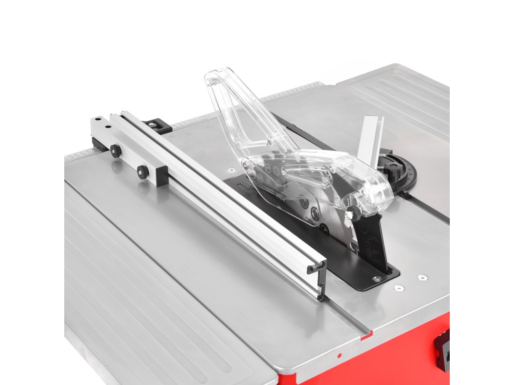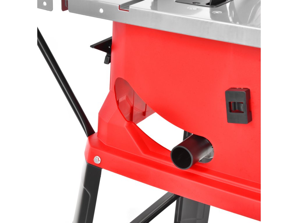 Z přední strany je umístěn bezpečnostní vypínač pro vyšší ochranu obsluhy. Součástí balení je boční doraz s pravítkem, posuvný úhelník pro šikmé řezy a ochrana kotouče s integrovaným adaptérem a hadicí pro odsávání pilin. Možnost připojení vysavače zlepšuje čistotu pracovního prostoru. V balení jsou dodány dva kotouče (1+1 zdarma).