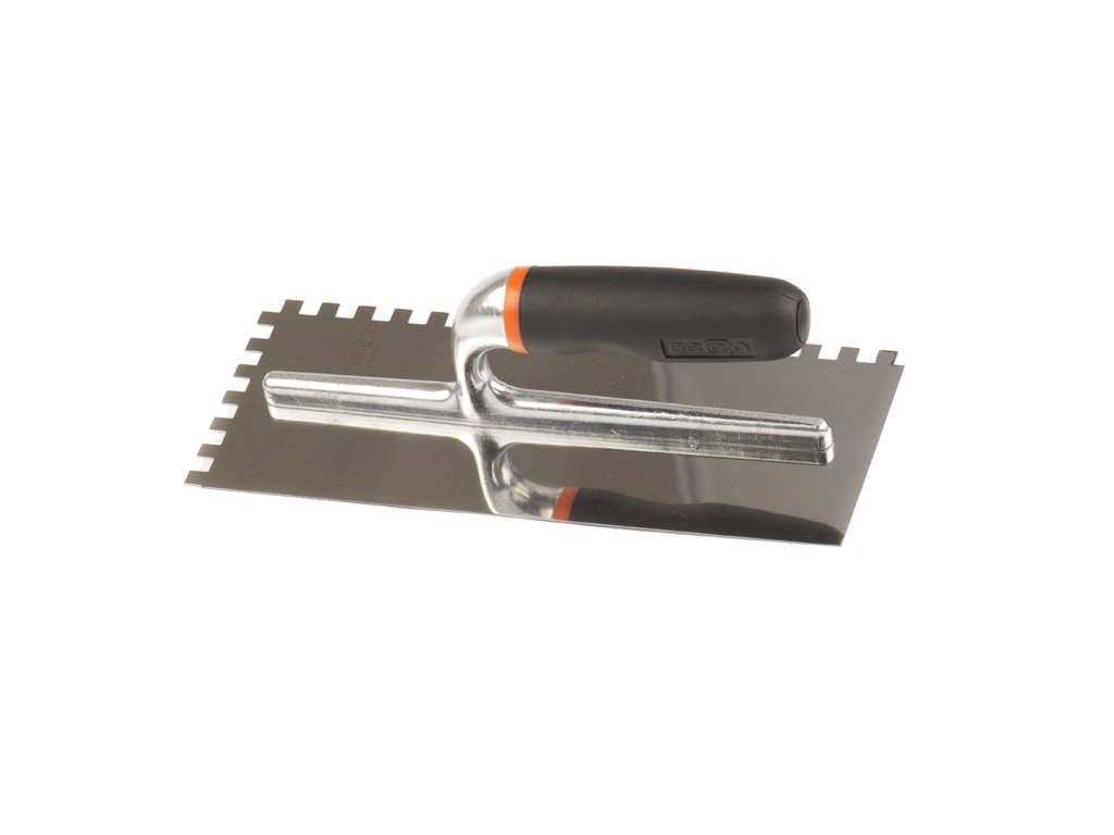 Nerezové zubové hladítko Becco 104836 o rozměru 28 × 12 cm s 10 zuby pro rovnoměrné nanášení lepidel, omítek a štuků.