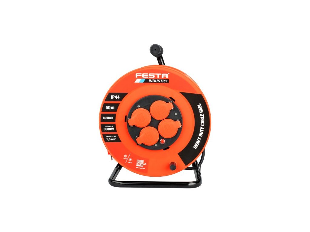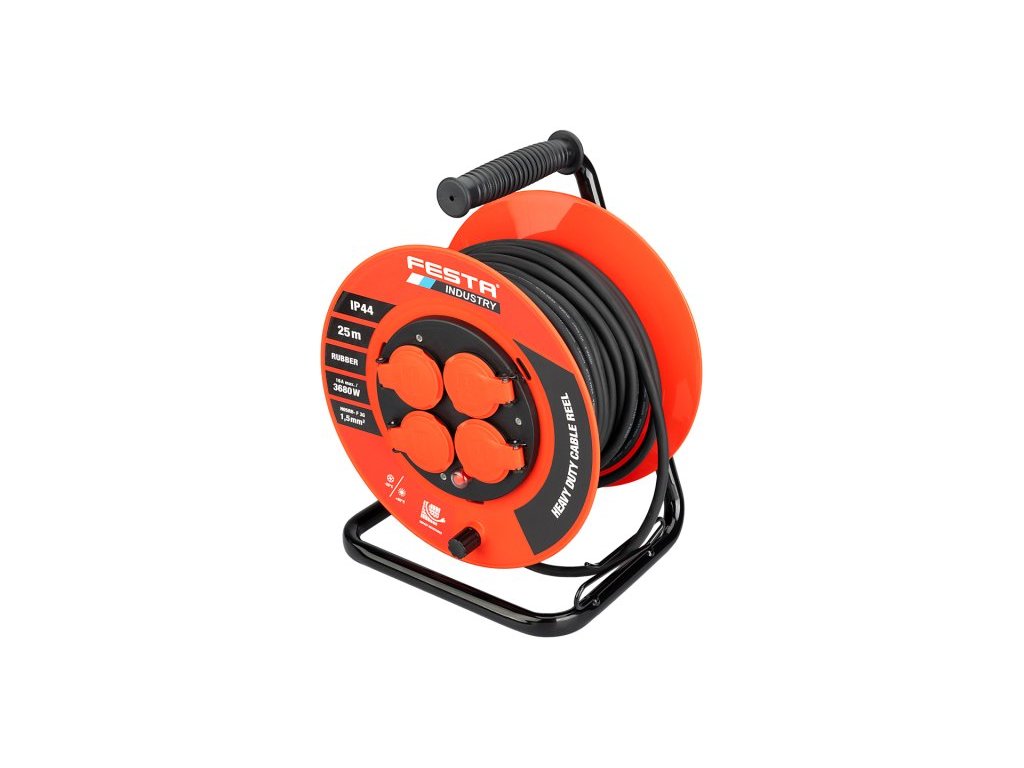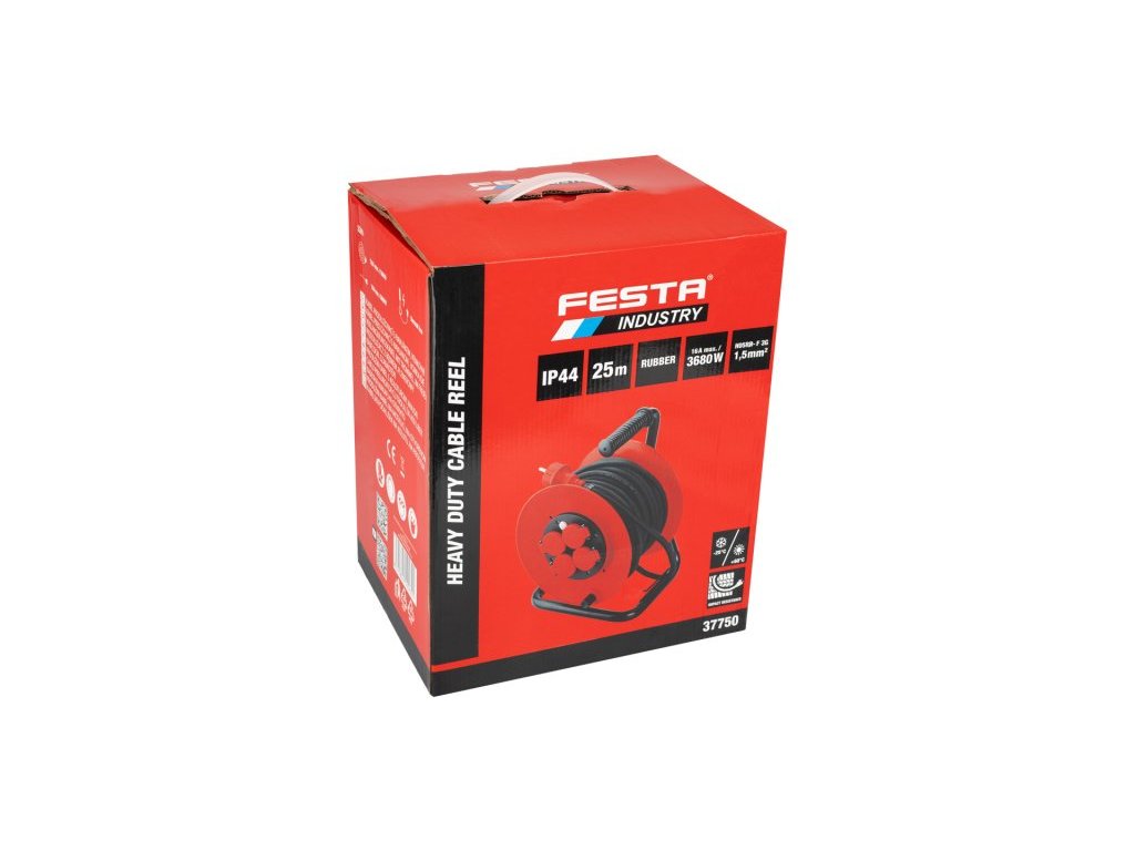 Prodlužovací kabel na bubnu FESTA INDUSTRY 37750 je robustní řešení pro venkovní i náročné pracovní podmínky. Díky čtyřem zásuvkám, délce 25 metrů a kvalitní gumové izolaci je ideální pro použití na stavbách, v dílnách i zahradách. Kabel o průřezu 3×1,5 mm² je dimenzován na 230 V a umožňuje zatížení až 3680 W při plném rozvinutí. Krytí IP44 zajišťuje odolnost proti prachu a stříkající vodě. Masivní kovová konstrukce s odolnou plastovou cívkou umožňuje snadnou manipulaci i stabilní umístění. Součástí je také tepelná pojistka, která chrání proti přehřátí.