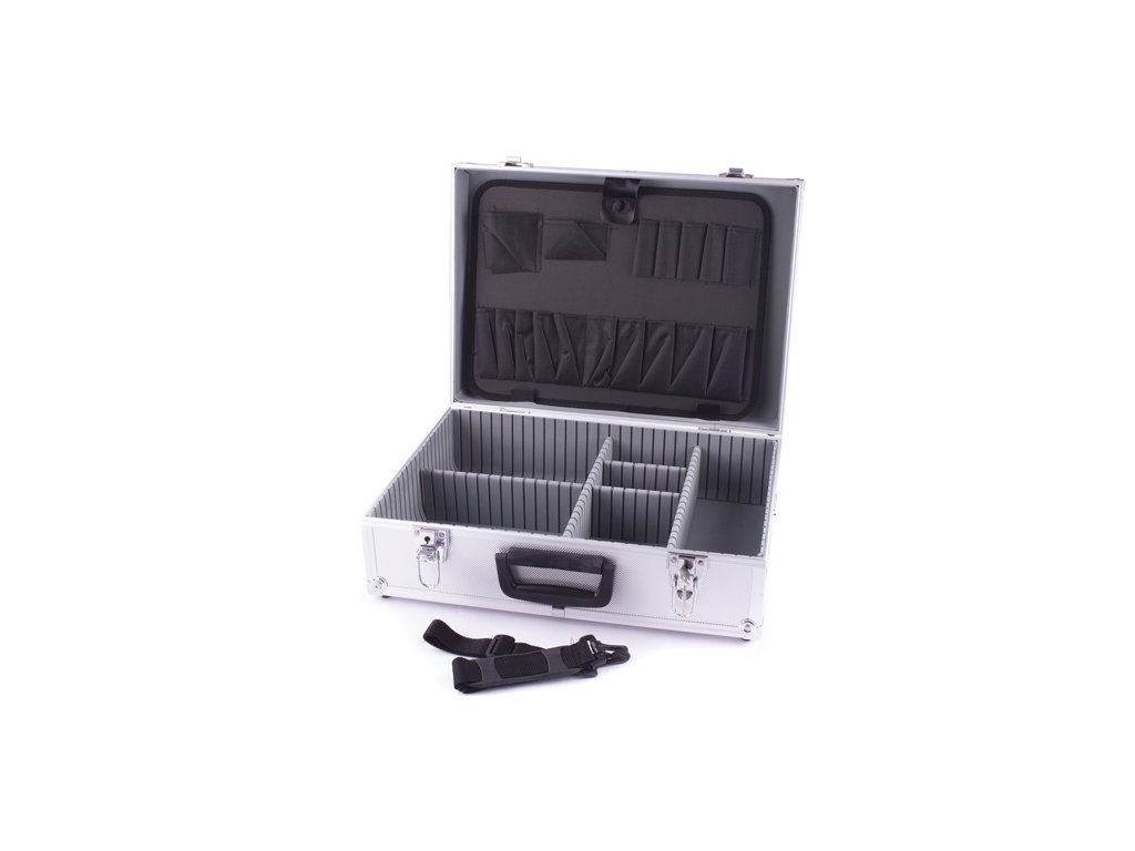 Robustní a elegantní hliníkový kufr Lobster 108001 o rozměrech 45 × 32 × 15 cm je ideálním řešením pro přehledné uložení a přenášení nářadí. Díky nastavitelným vnitřním přihrádkám si můžete vnitřní prostor snadno přizpůsobit svým potřebám. Sklopná deska ve víku je vybavena kapsami a poutky pro drobné nářadí, které tak budete mít vždy po ruce. Kufr má nosnost 5 kg, ramenní popruh pro pohodlné přenášení a uzamykatelné zavírání pro bezpečné uložení obsahu. Vnitřní prostor s rozměry 42,5 × 29,5 × 12,5 cm poskytuje dostatek místa pro běžné nářadí i příslušenství.
