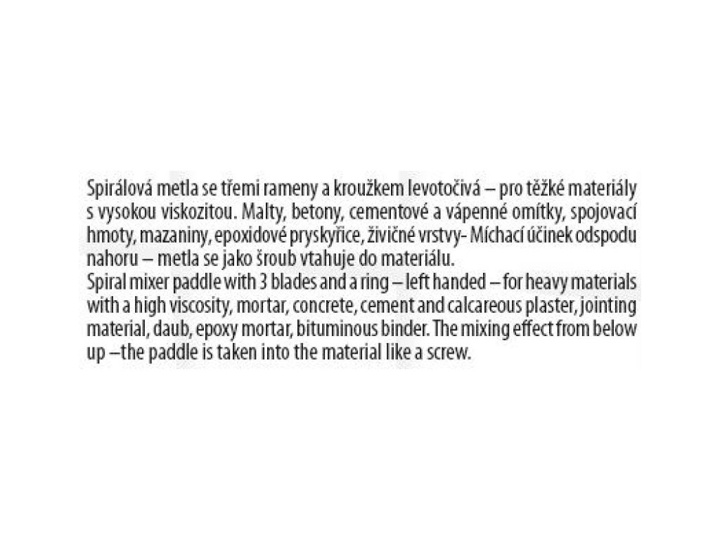 Míchadlo je pravotočivé, což znamená, že má míchací účinek odspodu nahoru – metla se šroubovitě vtahuje do materiálu a zajišťuje jeho rovnoměrné promíchání. Pozinkovaný povrch chrání před korozí a prodlužuje životnost nástroje i v náročných podmínkách. Ideální pro použití s elektrickými míchadly se závitem M14.