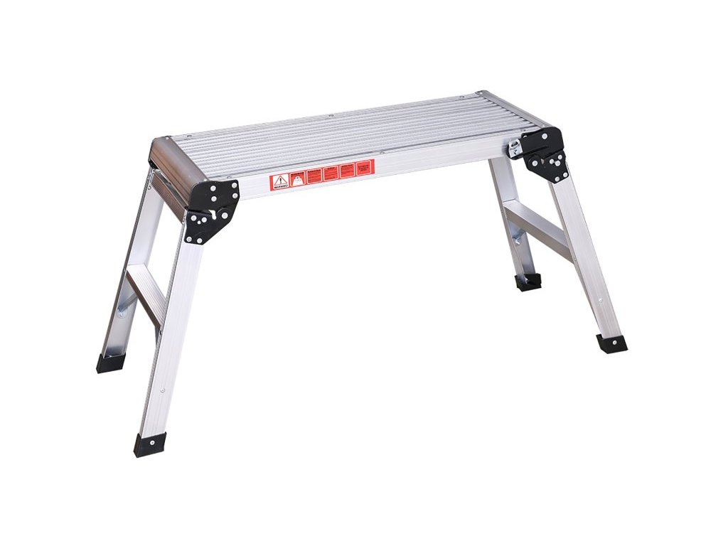 Hliníkový rám zajišťuje nízkou hmotnost a vysokou pevnost, přičemž maximální nosnost dosahuje až 150 kg. Skládací nohy s pojistkou umožňují rychlé složení a snadné uložení nebo převoz. Po složení má plošina kompaktní rozměry pouze 75 × 40 × 15 cm, což ocení každý řemeslník i domácí kutil.