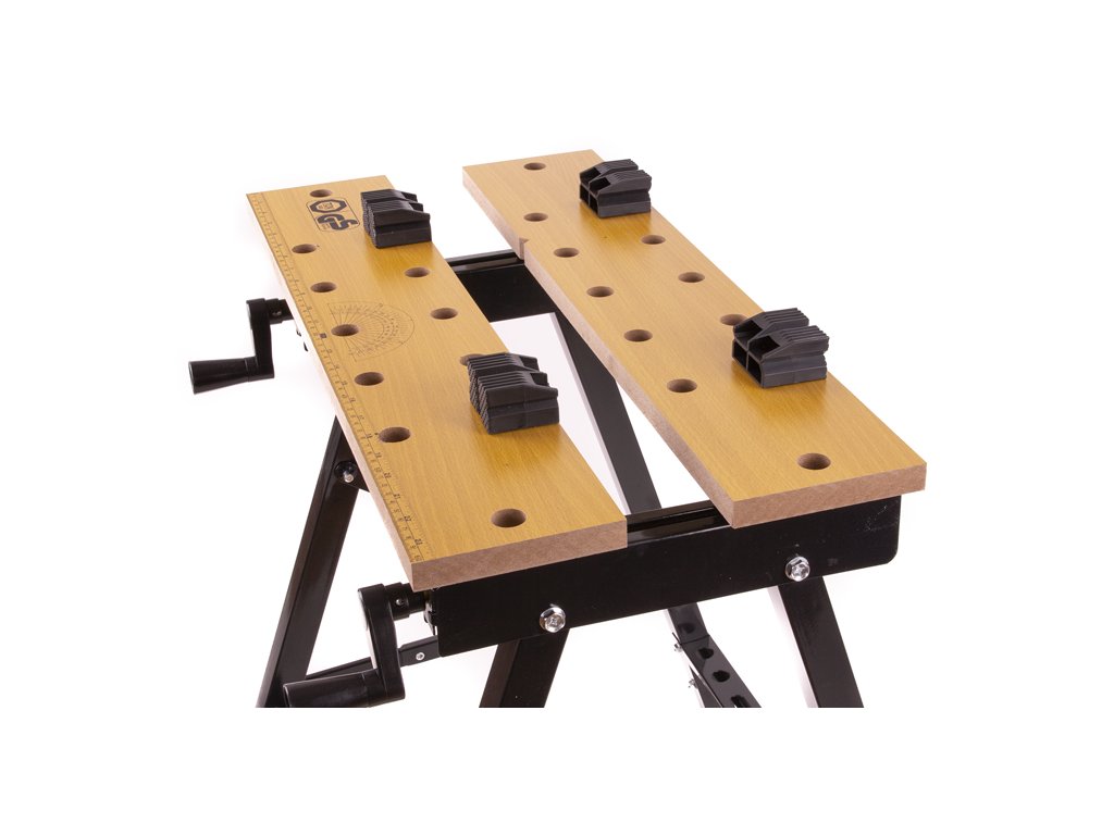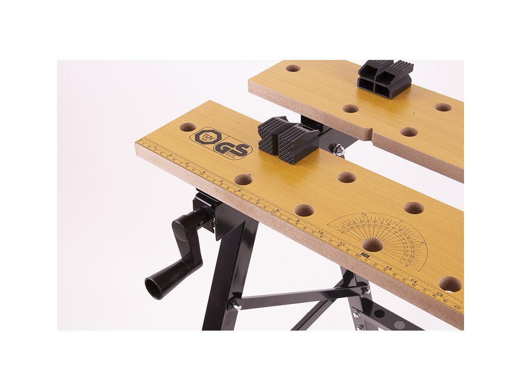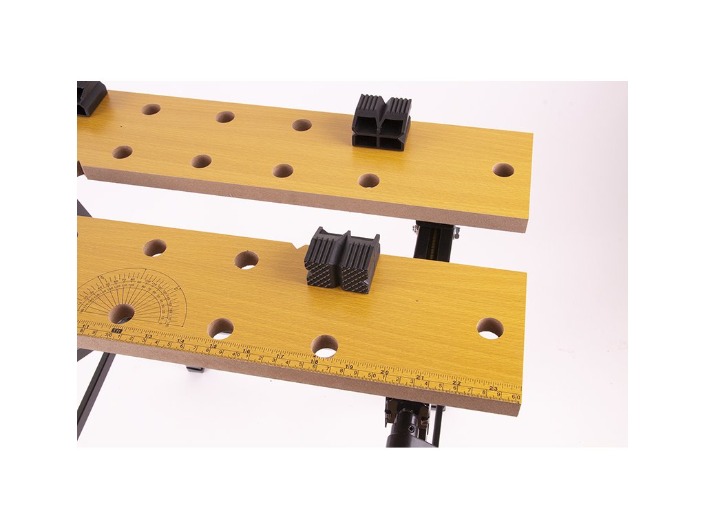 Pracovní plocha je tvořena dvěma posuvnými MDF deskami o rozměru 240 × 605 mm, které umožňují pohodlné upínání různých materiálů pomocí integrovaných PVC zarážek. Natištěné měřítko na pracovní ploše usnadní přesné měření bez nutnosti dalších pomůcek. Gumové nožičky zajišťují stabilitu i na hladkém povrchu.